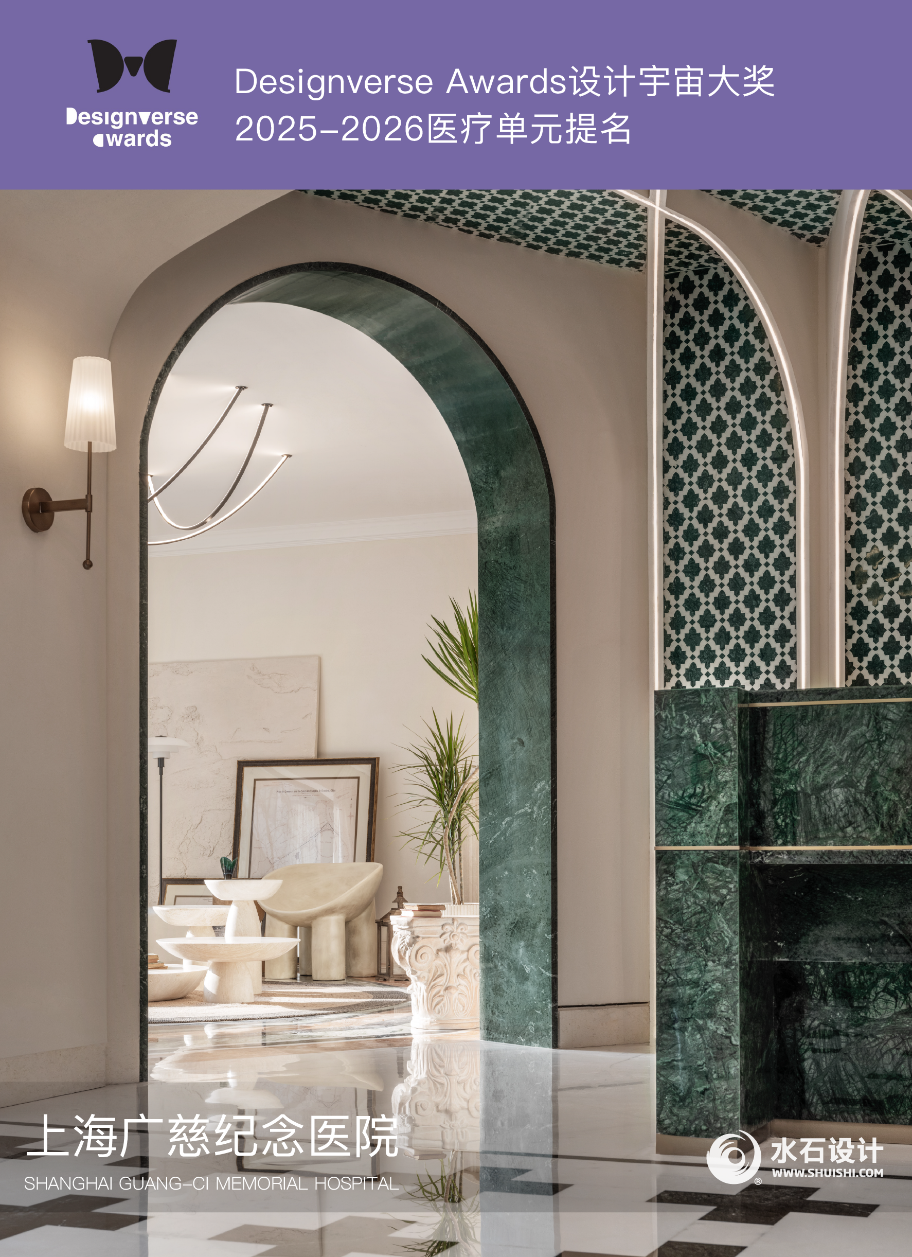 近日,Designverse Awards 设计宇宙大奖 2025-2026 医疗单元提名名单在 2025 医疗空间创新论坛公布,水石设计的上海广慈纪念医院作品斩获该奖项空间类医疗空间设计提名,水石 EPC 公司项目总监吴贵华出席了提名颁奖礼。