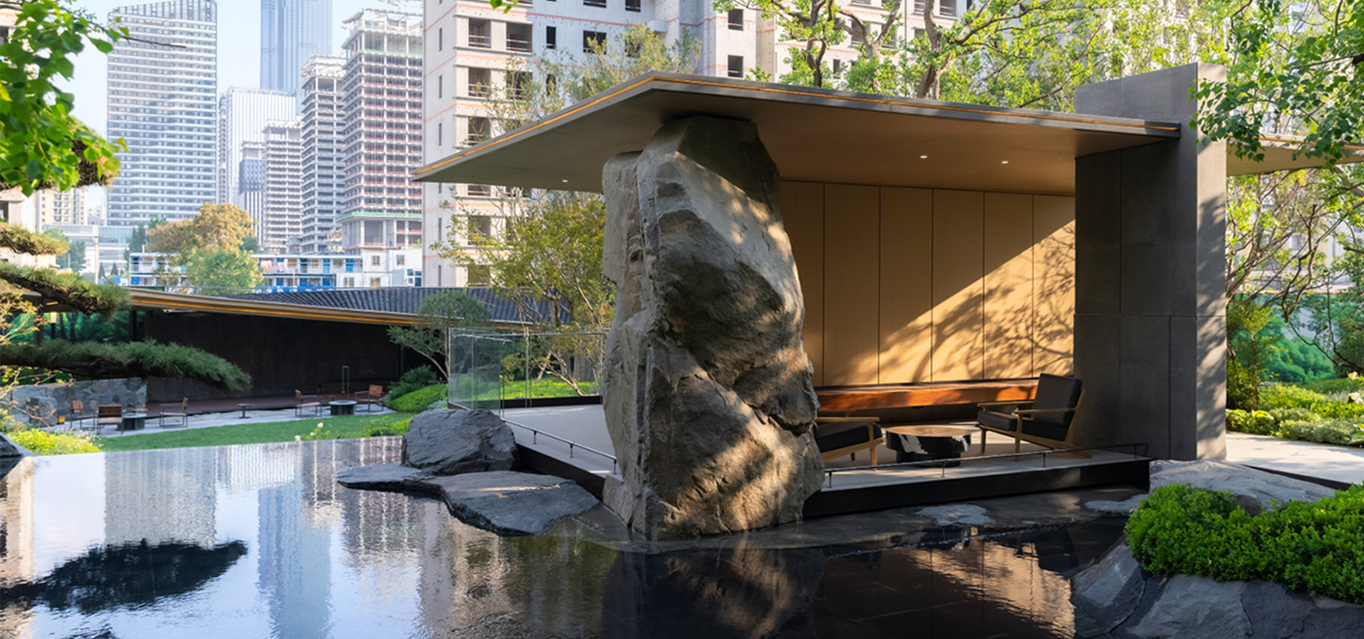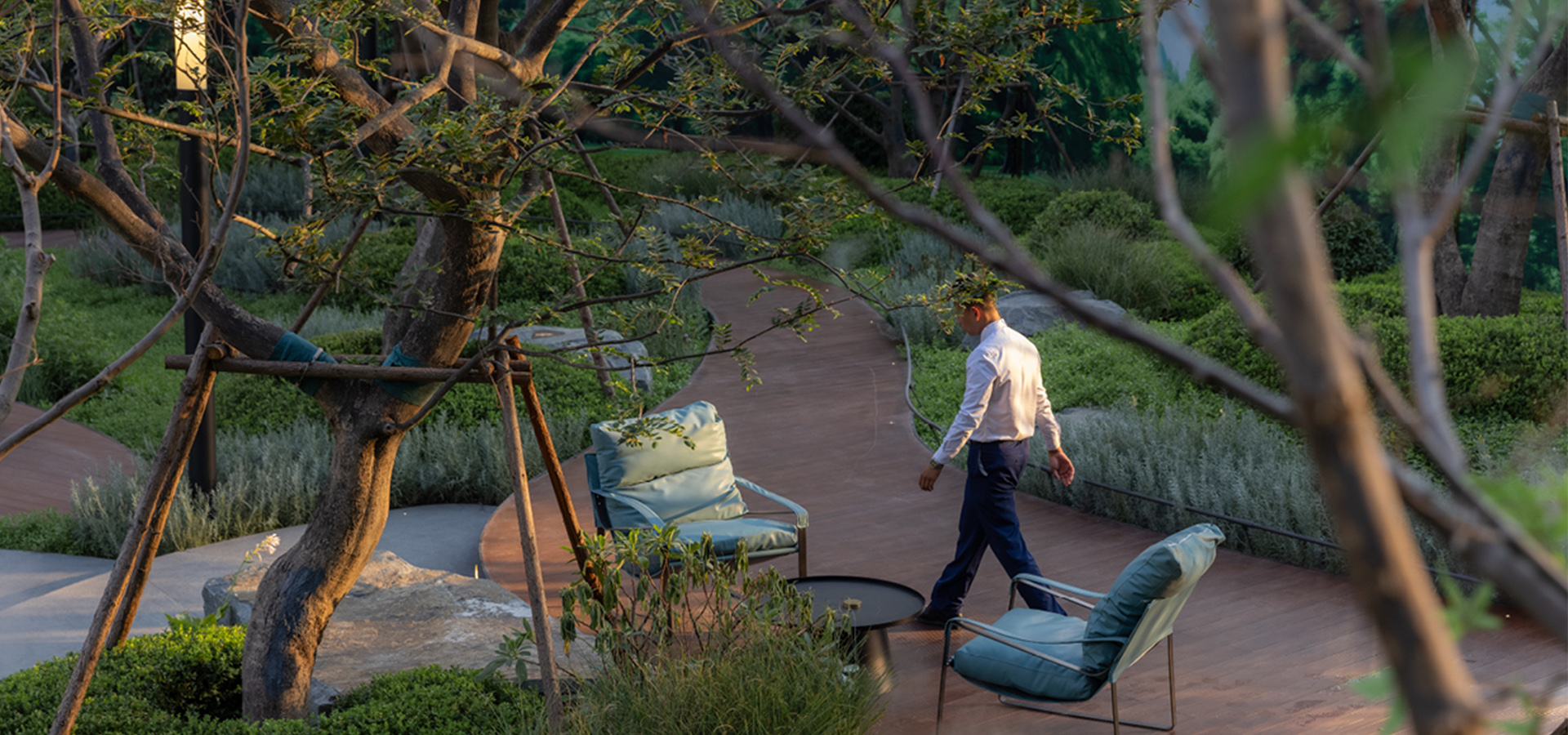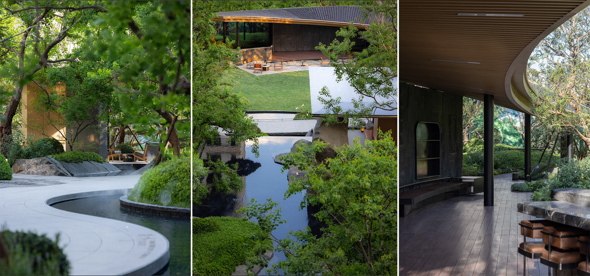 设计以立体山水诠释 “林泉之志”,石之亭以不规则巨石为撑,似从自然生长;溪谷栈桥蜿蜒,行人踏其上,光影随步流动,时光化作景观里的诗。飞廊旁斜飘红枫与景墙相映,夕阳穿叶隙,构成秋日画框,廊架兼具会客、野餐功能,通透融于自然。