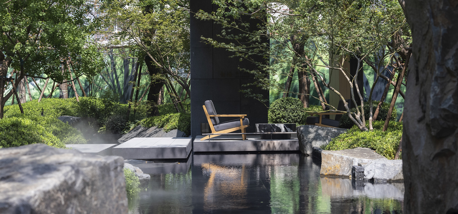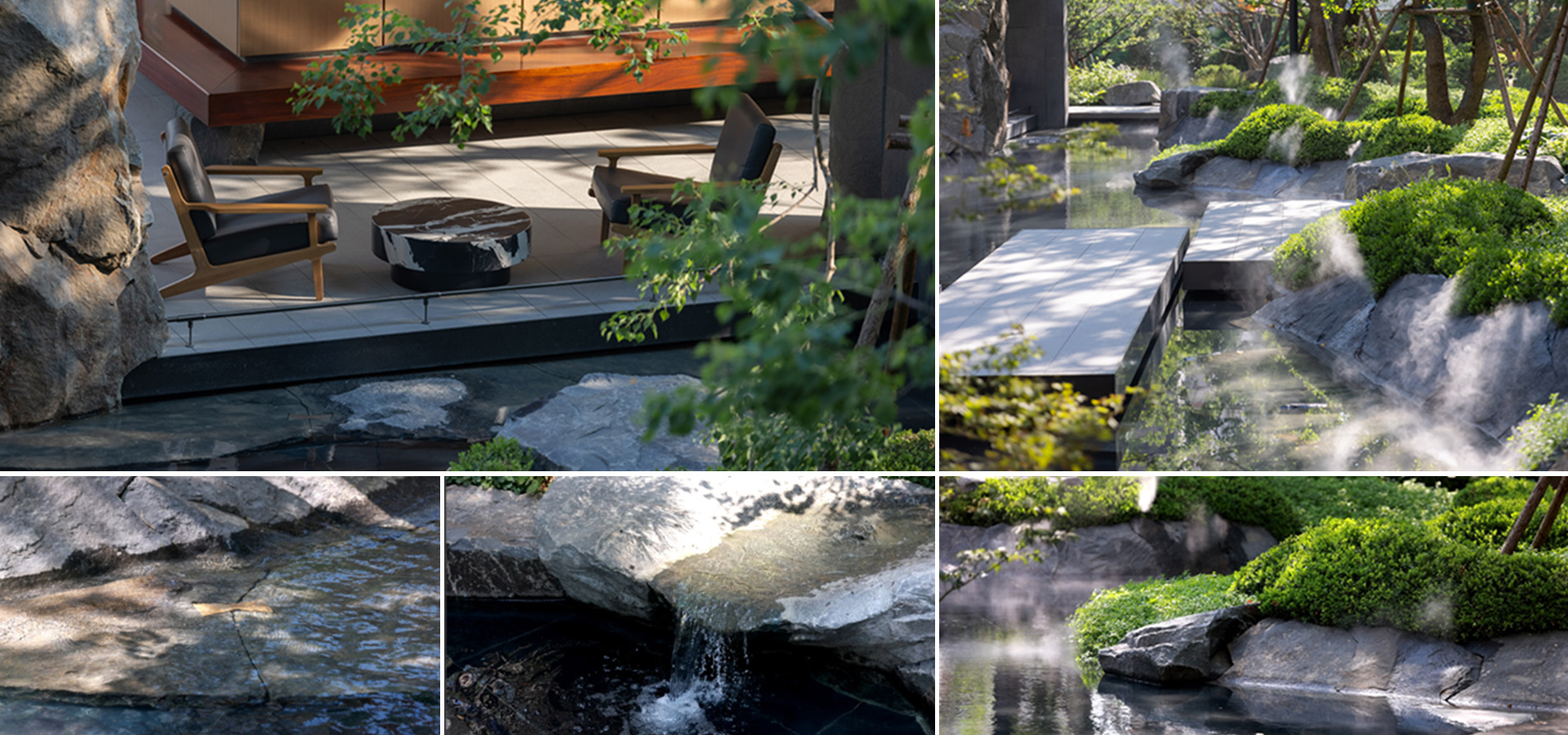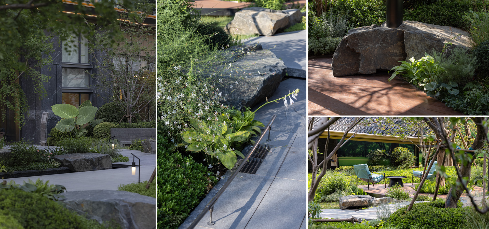 踏水区松石引水,水雾漫诗意,入户时凉意伴水鸣,洗去喧嚣。植物造景选造型松、乌桕、红枫等,龟背式地形配乌柏林,显东方灵韵。工艺上,仿石石英砖划水陆,自然面石材防滑,多材质立面增层次,兼顾美学与实用,成就四季皆雅的心灵栖息地。